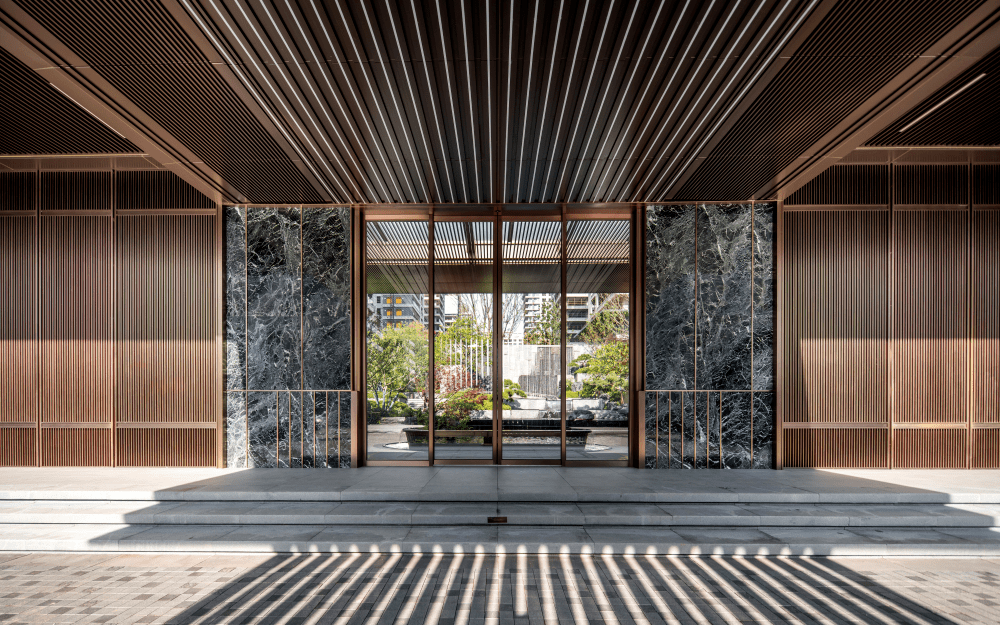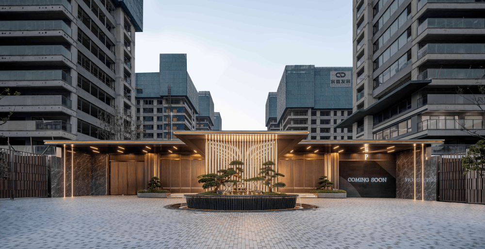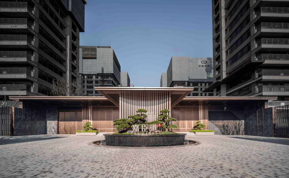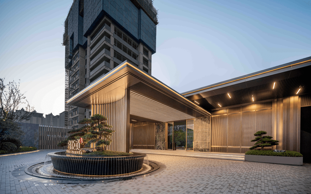 约5.8米高的景象柱和约50米豪华沿街景墙,大气特别,一线城市豪宅御用石材数码理纹仿大理石大版尺度干挂上墙,气度面子,开释出现代美学的质感。