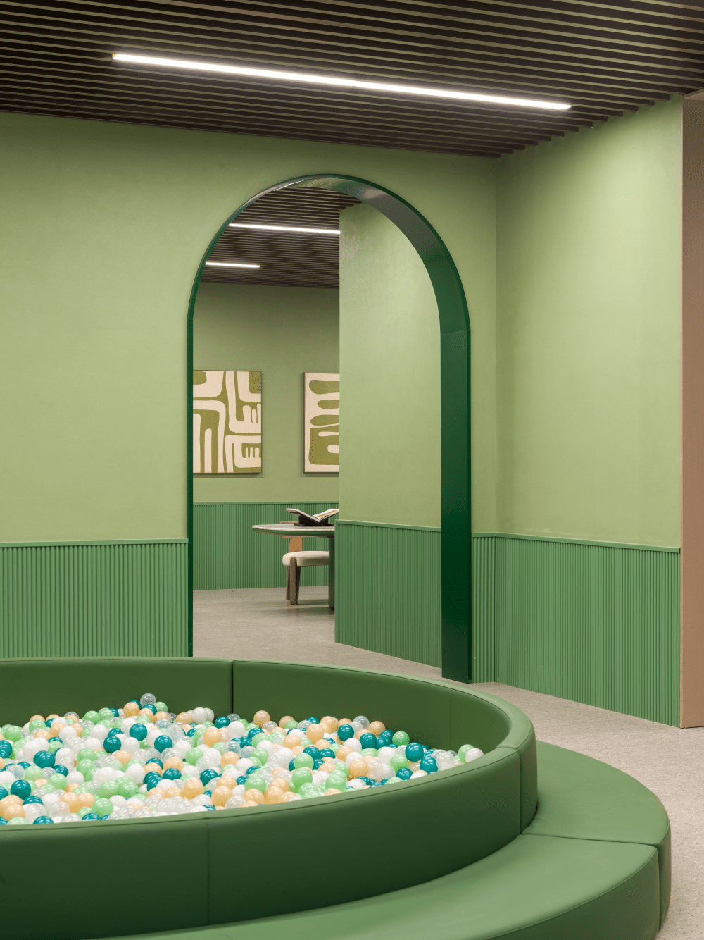 架空层空间则定位打造为儿童主题森系空间,包含归纳活动空间、儿童文娱空间、儿童手艺空间、阅读室、休闲招待等几大空间,墙面更是添加了竹炭纤维板原料的墙裙,应用在儿童空间更环保、安全,细节之处见真章!