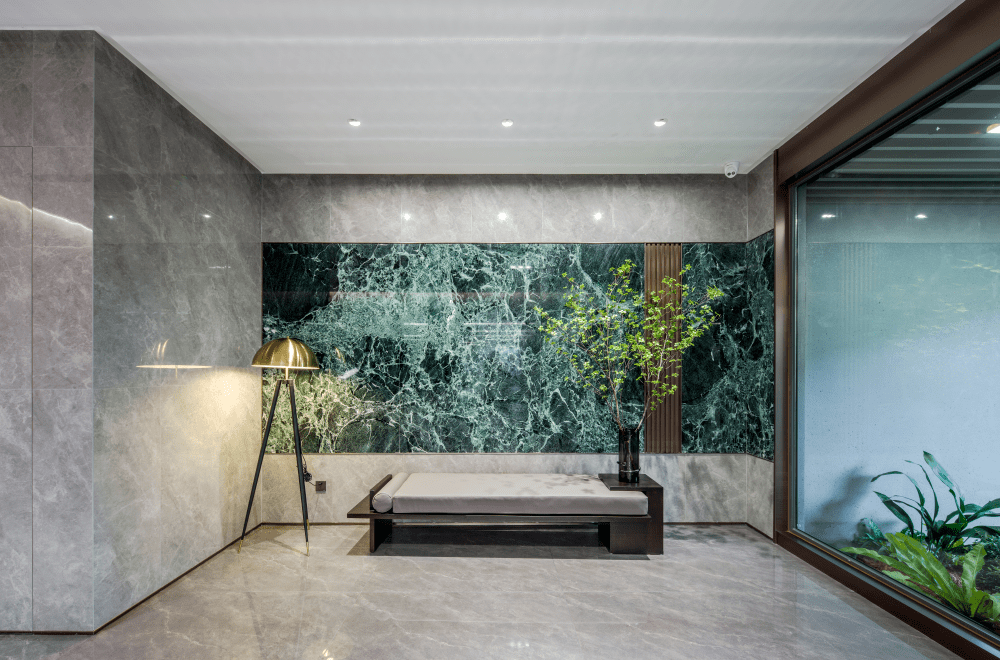 比方艺术馆等级的大堂,18#硬装上选用了石材肌理感较强的深灰色墙地砖,与普拉达绿奢石布景调配更显质感。