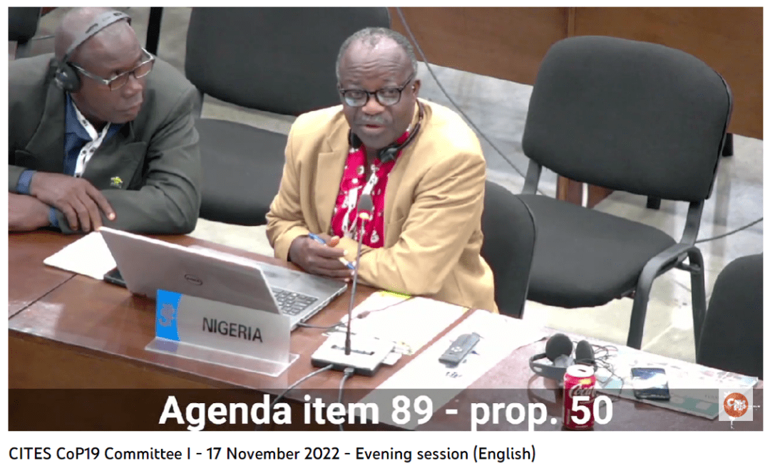 第50号提案由科特迪瓦、利比里亚、马拉维、塞内加尔和欧盟提出,将一切非洲的紫檀属树种【Padauk ( Pterocarpus spp. ) in Africa:the registration of the entire genus Pterocarpus】列入附录II,在此之前的2017年和2019年,其间的刺猬紫檀 Pterocarpus erinaceus 和染料紫檀 Pterocarpus tinctorius 就已承认进入了附录II。在植物分类学方面的科学作业的人没有承认的情况下,西非、东非和中部非洲的34个国家总计记录了12个紫檀属树种,在国际市场流转的称号则包含了Padauk(花梨木)、Vène(单板木)和Rosewood(红木)。一起这个属的木材也是我国红木工业(hongmu industry)所依靠的重要原材料。关于疣猴和黑猩猩来说,紫檀属树木的叶是美味佳肴。刚果共和国和喀麦隆并不愿意承受本提案,但他们的孤立性使其采纳不对立的情绪,以协商共同方法同意该提案。