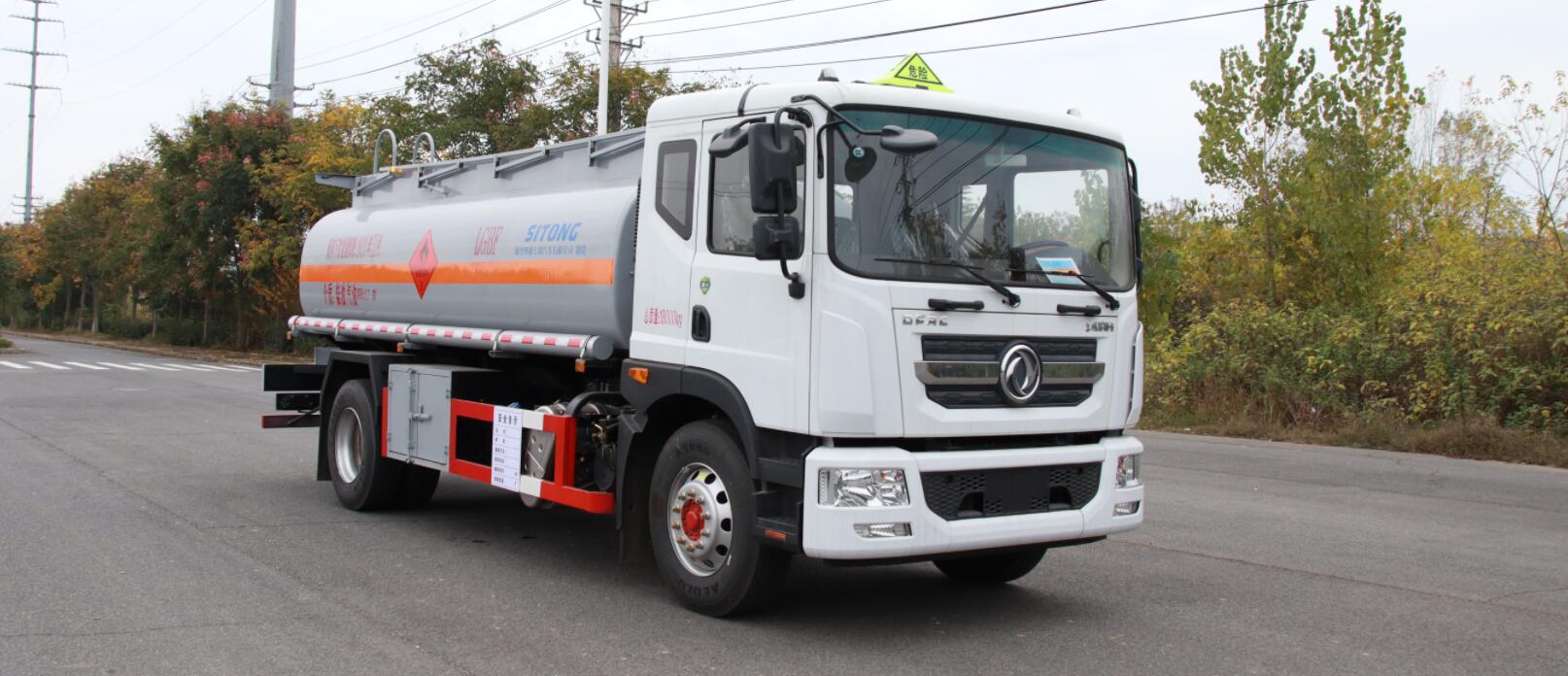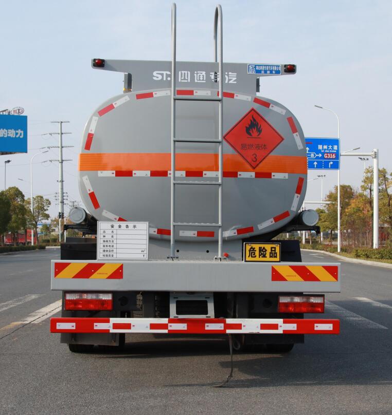 罐体总容量:12.7立方米,罐体有效容积:12.1立方米,罐体外形尺寸(长×宽×高)(mm):5800×2000×1350;该车适用于危险品运输,危险货物运输车辆类型:FL型.准运介质最大密度:830千克/立方米;侧防护和后防护装置材料均为Q235,侧防护和后防护装置连接方式均为螺栓连接,后防护断面尺寸:120×60(mm),离地高度为490mm;安装具有卫星定位功能的行驶记录仪,安装限速装置,限速80km/h.该车型可选装直接供电式ETC车载装置.EBS系统生产厂家,型号:襄阳东风隆诚机械有限责任公司,EBS/ESC-d.发动机型号及油耗值(L/100km)为: CY4SK761 (26.8),D4.5NS6B220 (26.6),YCS04200-68(26.4)B6.2NS6B230(26.1).仅选用排气管前置,前轮盘式制动器,转向轮安装轮胎爆胎应急防护装置,仅采用子午线轮胎,该车后轴采用空气悬架.仅采用4700mm轴距.