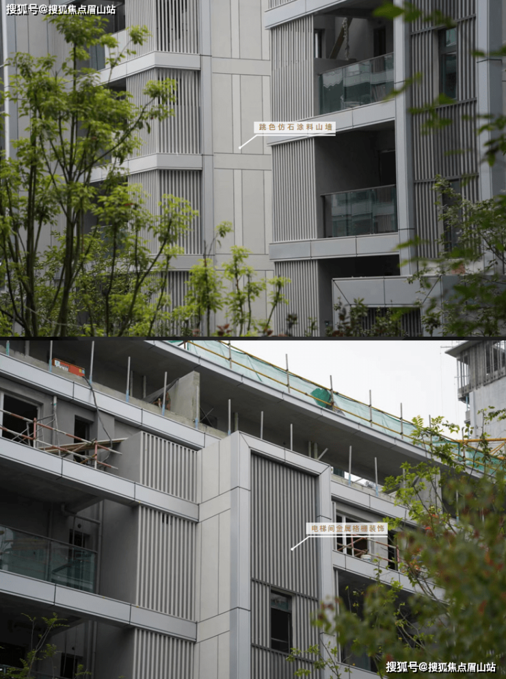 山墙面依然能看到拉通的铝板线条,主要墙体虽然是漆,但采用的是比普通涂料成本更高的水包水真石漆,并通过两种色彩错拼提升美观度。