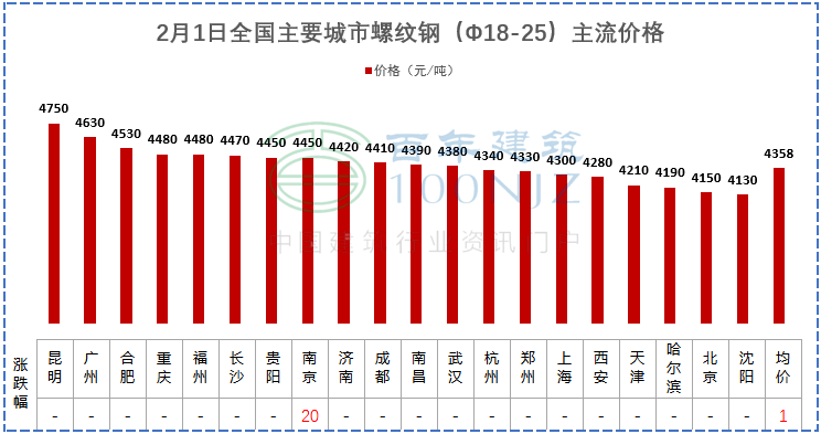 2月1日Myspic螺纹钢肯定价格指数4388.3,日环比上涨0.01%。全国25个首要城市HRB400(20mm)螺纹钢均价4358元/吨,上涨1元/吨。其间南京的涨幅最大,上涨20元/吨。要点城市:北京4150元/吨;上海4300元/吨;广州4630元/吨;西安4280元/吨。