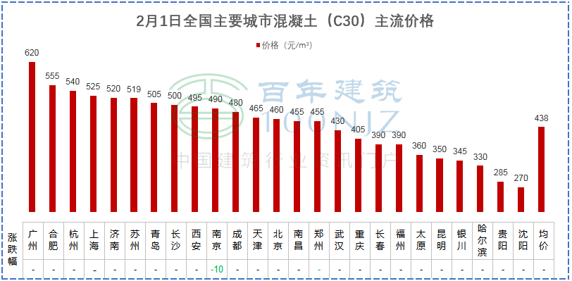 2月1日百年建筑网混凝土指数459.82,日环比下降0.13%,全国34个首要城市C30现款、非泵均价438元/方,较上个交易日相等。要点城市:北京445-465元/;上海510-530元/方;广州580-600元/方;西安490-510元/方。
