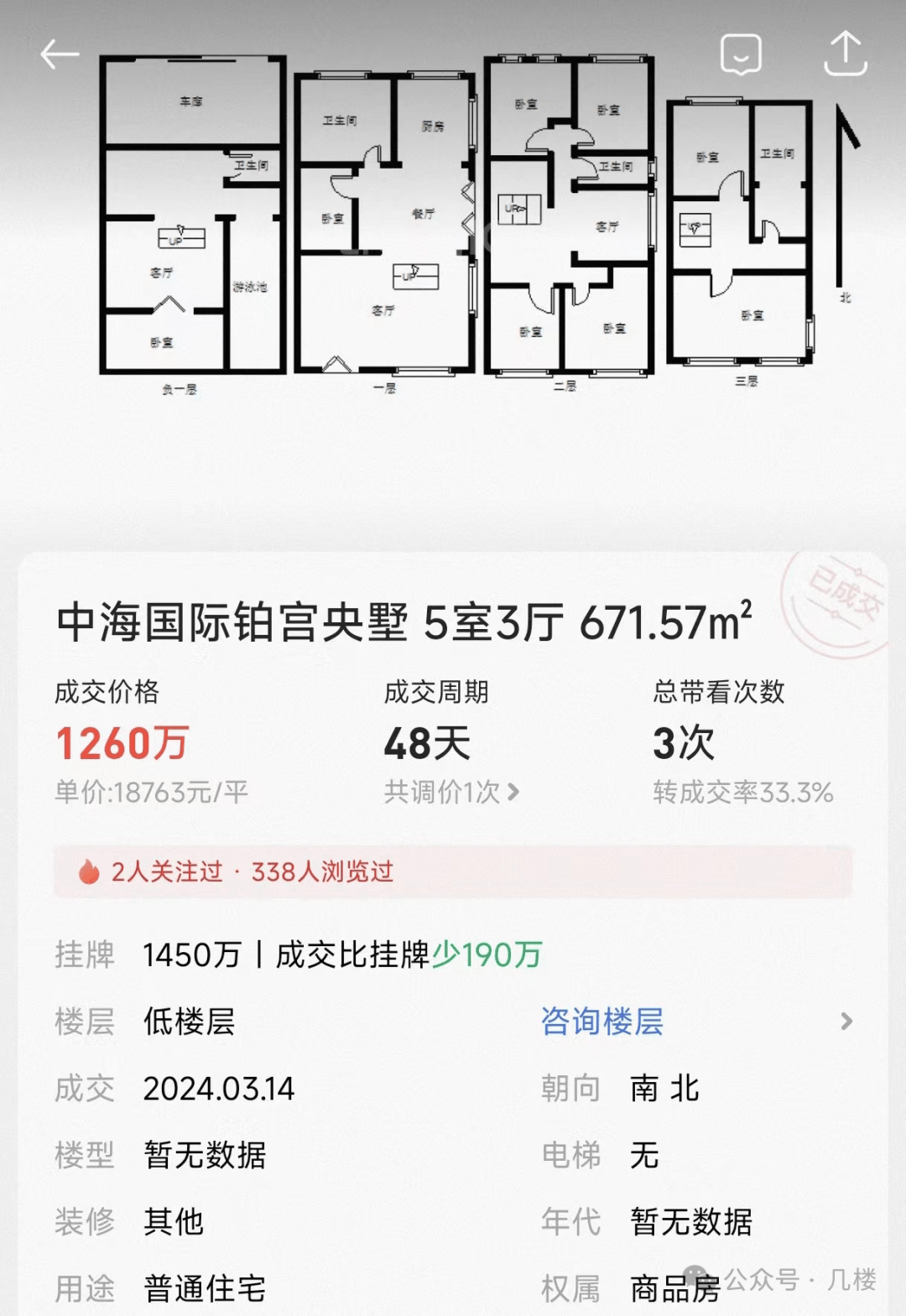 相同再看一套别墅的成交价格,二环南中海世界社区的别墅,单价18000+,总价约束住了这个片区的房产流通性。