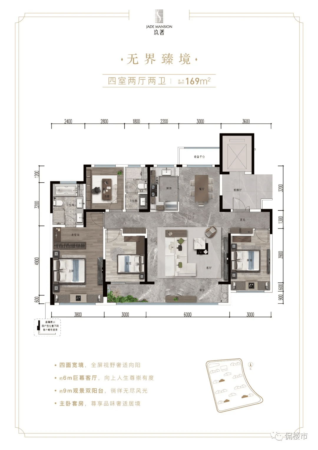 项目外立面才用石材+仿石材铝板,小区内部还设有超大中庭景象,六级社区场景和约1500㎡十大主题功用空间(恒温泳池、有氧健身房、室内高尔夫球室、沙壶球室等),户型还选用巨幕大平层,最大约4.5m整面落地玻璃。