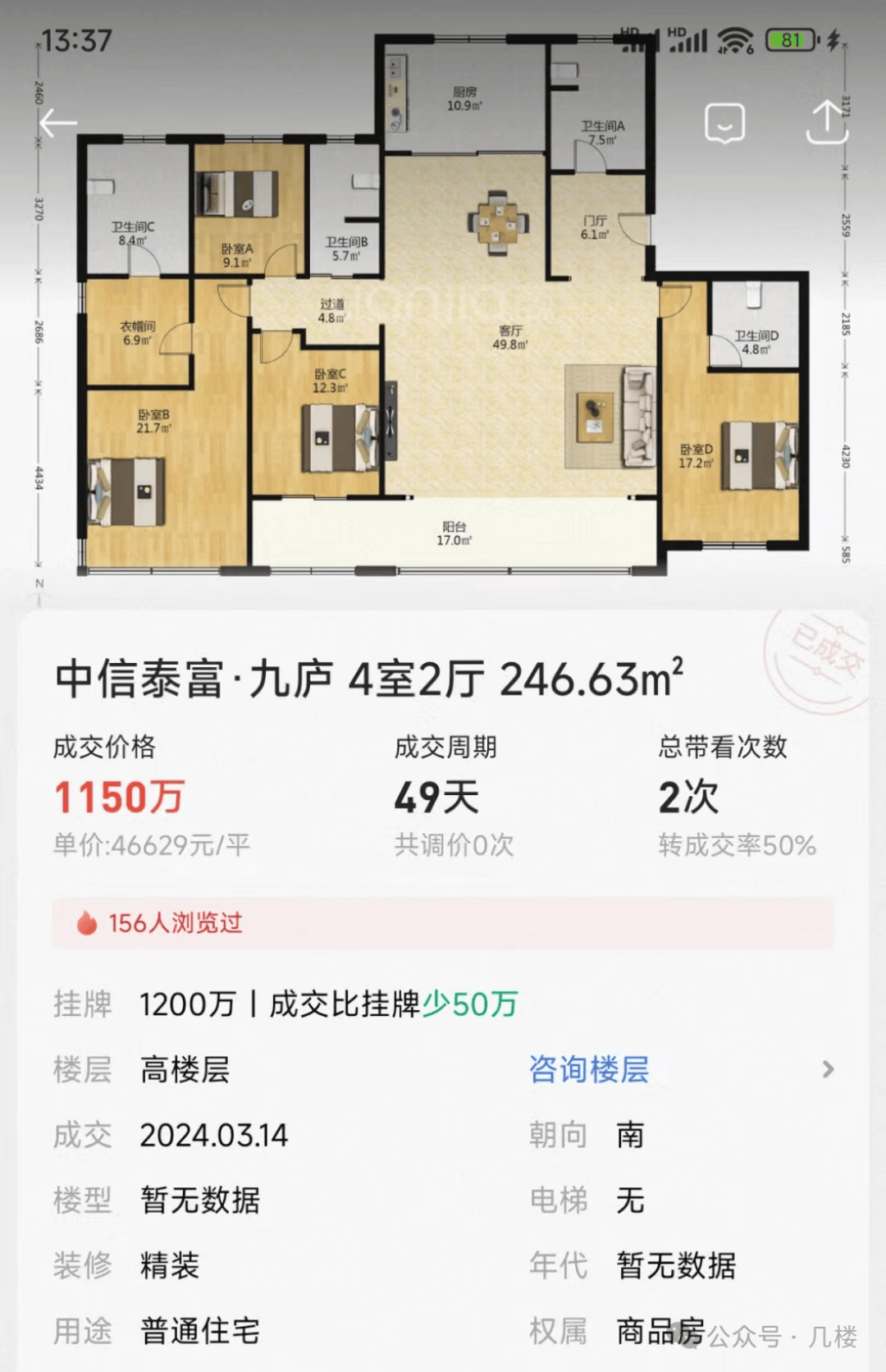 看中信泰富九庐最近贝壳上的成交价格我也震动了,挂牌缺乏俩月,就以高价格成交了。